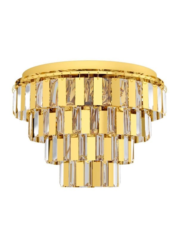 Loftlampen ERSEKA er fremstillet af en række vekslende plader i messingfarvet metal og klart brilantglas. De værdifulde brilantglaselementer skaber et funklende og elegant udseende, så snart lampen tændes. Loftlampen passer elegant ind i en moderne boligs