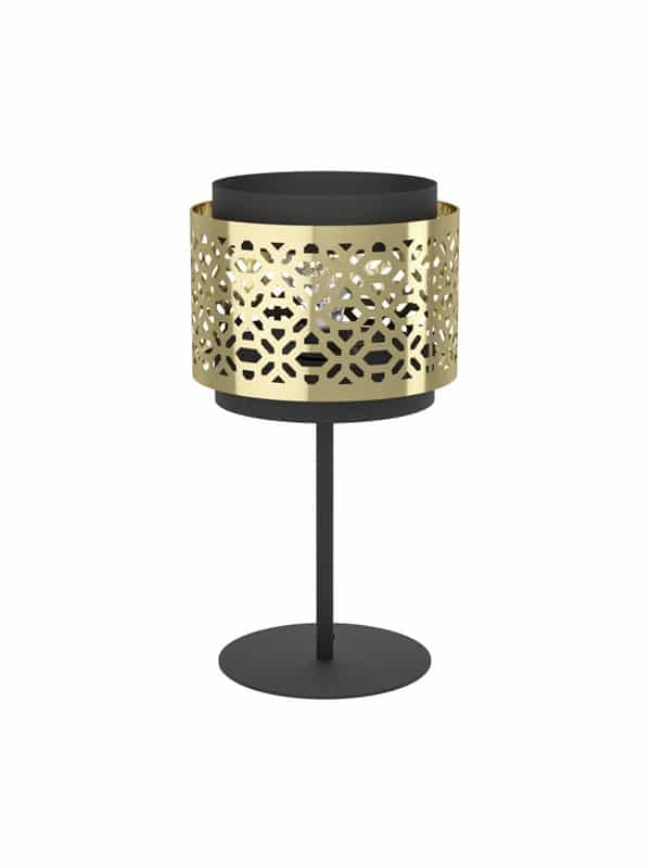 EGLO SANBACH bordlampe i sort med skærm i messing med huldekorationer. Med gennemgangsafbryder. Højde 45 cm, diameter 24 cm. E27, max. 40 watt. Leveres ekskl. lyskilde. IP20. EGLO SANBACH bordlampe er en elegant og moderne belysningsløsning, der kombinere