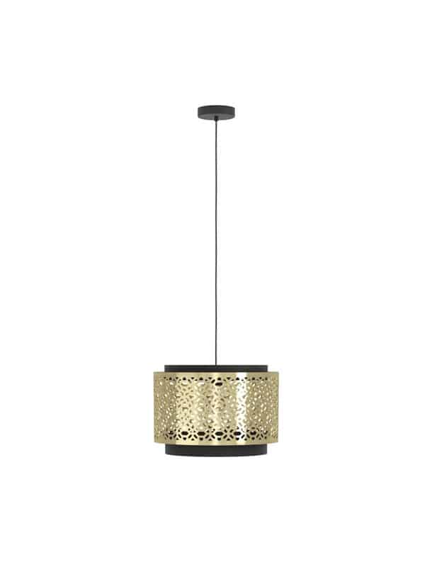 EGLO SANBACH pendel i sort med skærm i messing med huldekorationer. Med sort tekstilledning. Højde 110 cm, diameter 42 cm. E27, max. 40 watt. Leveres ekskl. lyskilde. IP20. EGLO SANBACH pendel er en stilfuld og moderne belysningsløsning, der kombinerer en