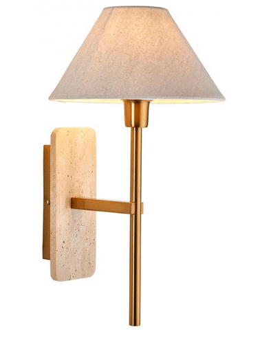 FARO Væglampe udført i et luksuriøst design af antik messinglakeret stål, travertin og med skærm i naturfarvet linned. Lampen måler 40,5 cm i højden og anvender 1 x E14 lyskilde (ekskl.).