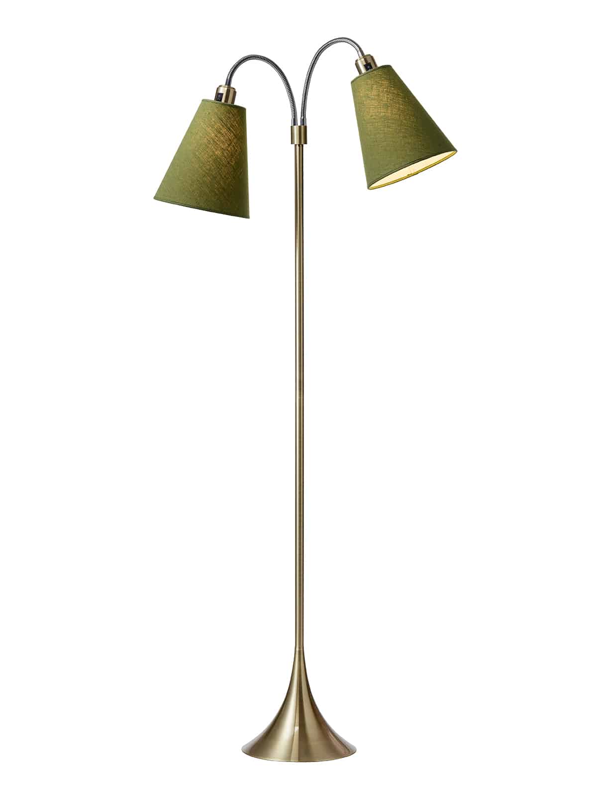 Der medfølger 210 cm. sort ledning til lampen. Lampen bruger 2 x standard pære med stor fatning (E27) som skal tilkøbes. Lampen har afbryder på hvert lampehoved. Fodgænger Gulvlampe i Antik Messing med Mørk Armygrønne Skærme Oplev den unikke kombination a