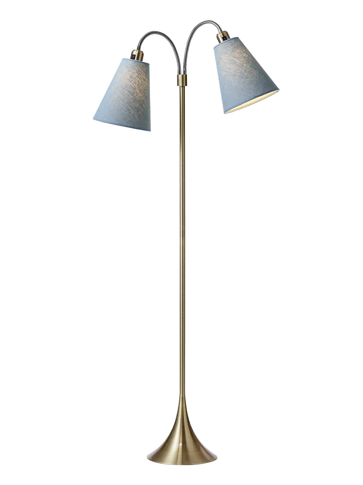 Der medfølger 210 cm. sort ledning til lampen. Lampen bruger 2 x standard pære med stor fatning (E27) som skal tilkøbes. Lampen har afbryder på hvert lampehoved. Fodgænger Gulvlampe i Antik Messing med Støvet Blå Skærme Oplev den tidløse elegance med vore