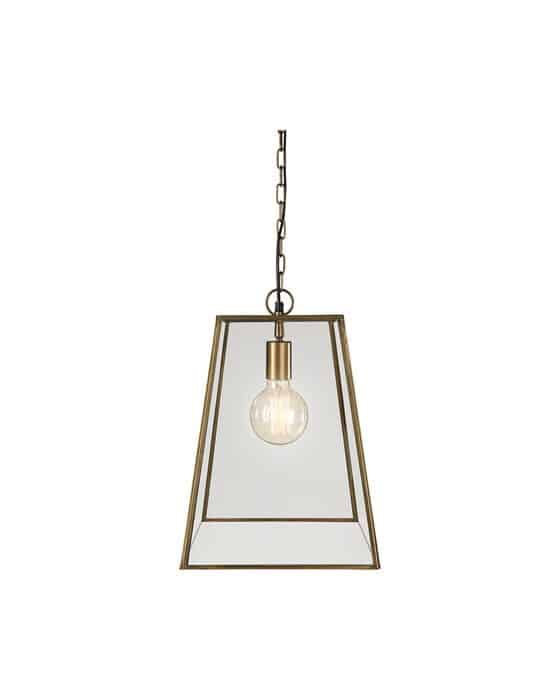 Elegant, minimalistisk loftlampe med slanke træk i antik messingfinish. Slim City loftlampe fra Artwood er fremstillet af jern med glaspaneler. Ledningens længde er 120 cm og kædens længde er 200 cm. Pærer med fatningstype E27 medfølger ikke. Maks. 40 watt.